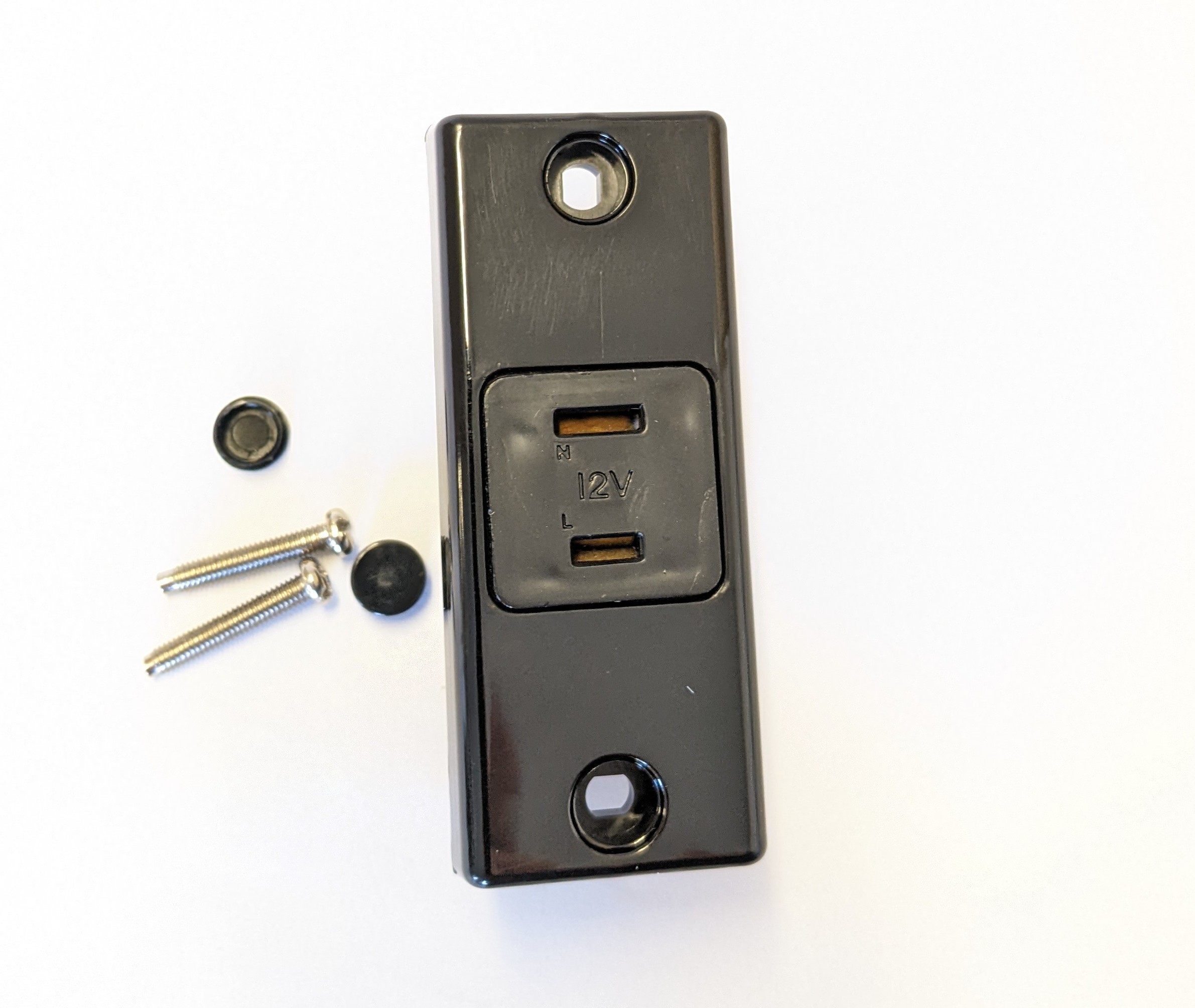 Slimline architrave socket for parallel 2 pin plug used in 12V systems in caravans and motorhomes where there is limited space.