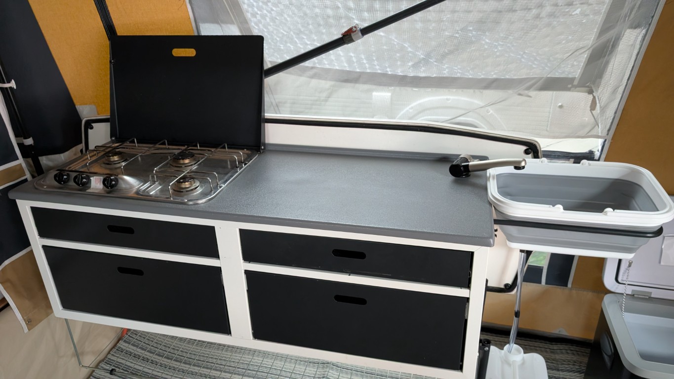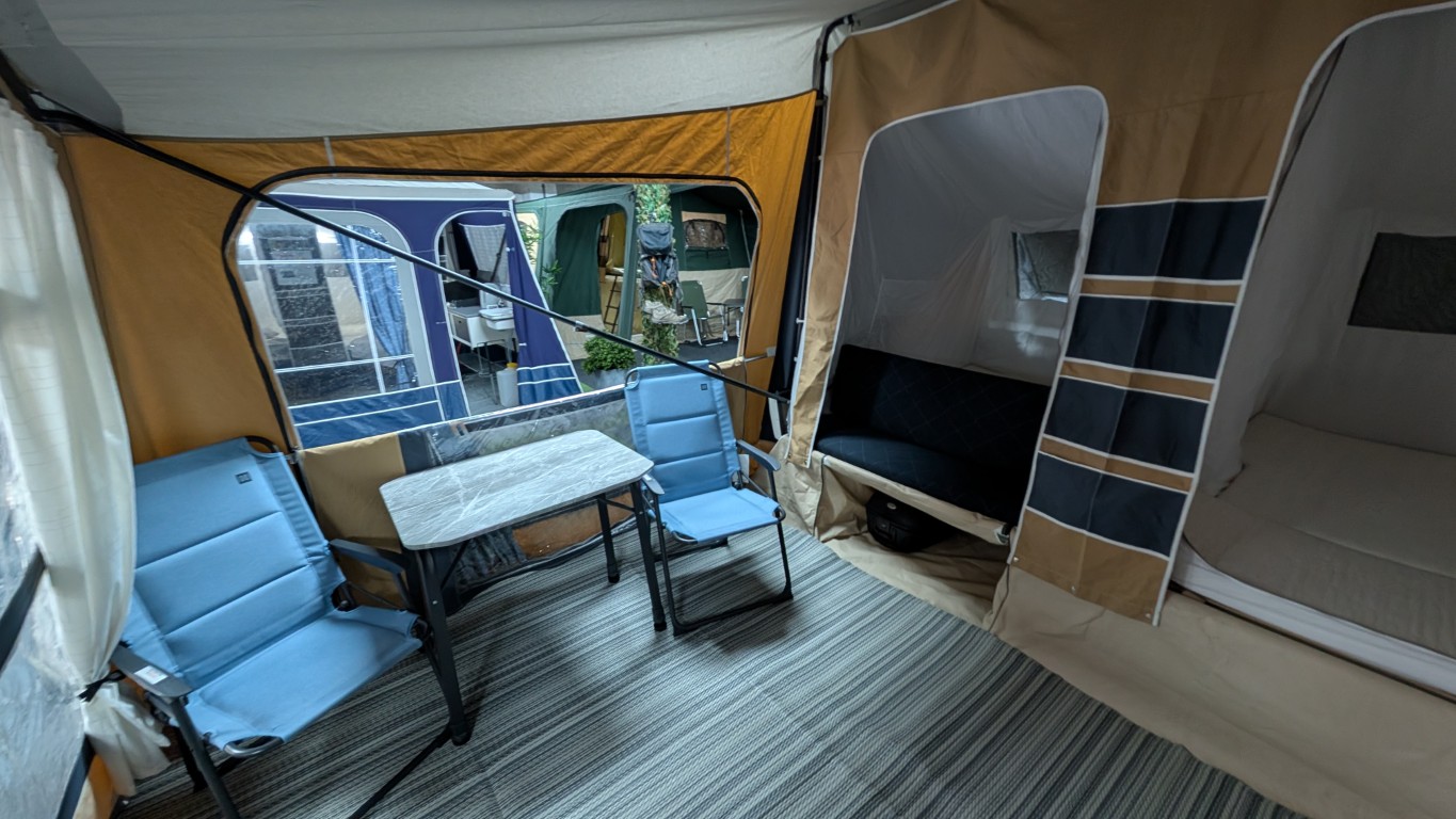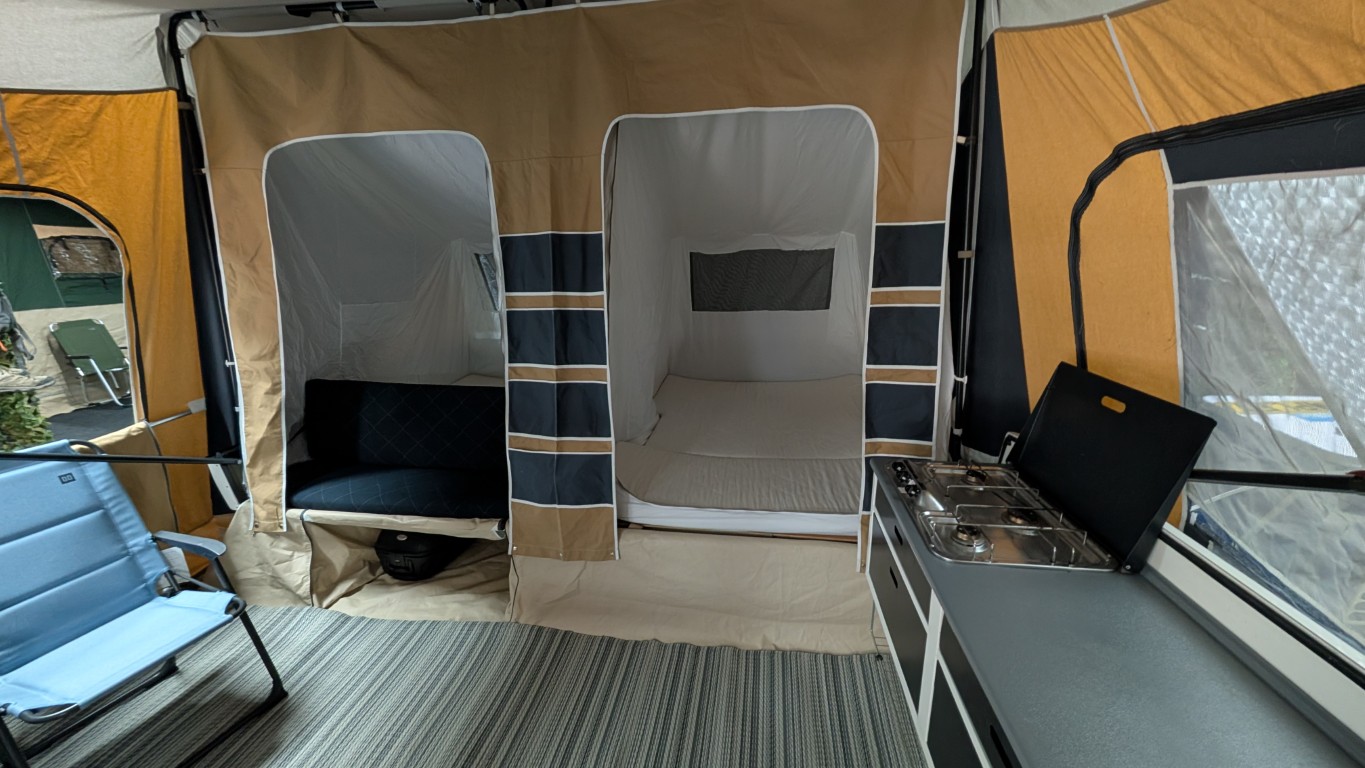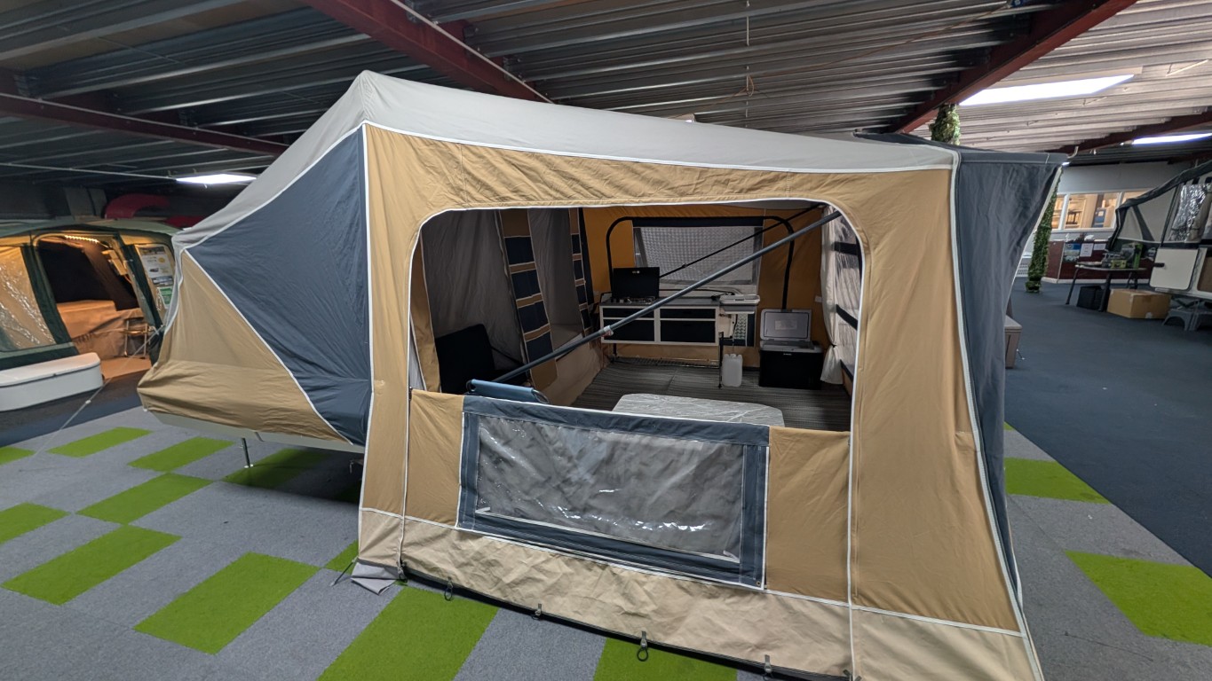 Quite a rare model. Not many of them currently available, and tend to be quite sought after as an alternative to the Camp-let Classic or North. The main difference is the peak to the roof, giving you that higher head space, making the living area feel larger. Have the confidence of buying this trailer tent complete with a 12 month guarantee and detailed demonstration on handover.(Ts and Cs apply) |