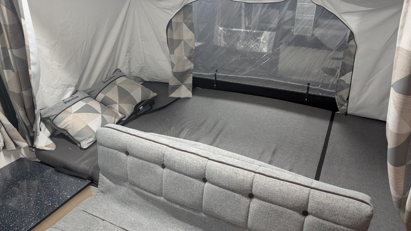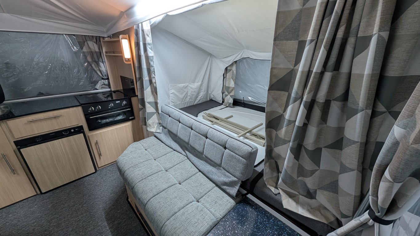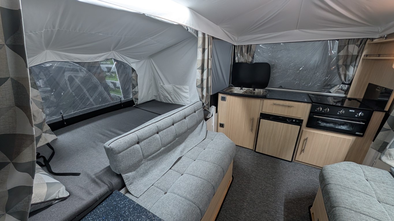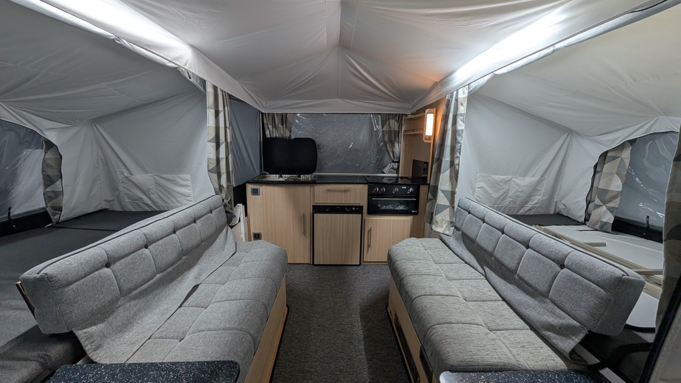 Latest style Countryman with Isabella acrylic canvas. Comes with the full awning and bed skirts. Lot's of extras inside like a hob, grill, fridge, hot and cold running water. Even has a built in heater if you fancy a bit of cold weather camping. Have the confidence of buying this trailer tent complete with a 12 month guarantee and detailed demonstration on handover.(Ts and Cs apply) |