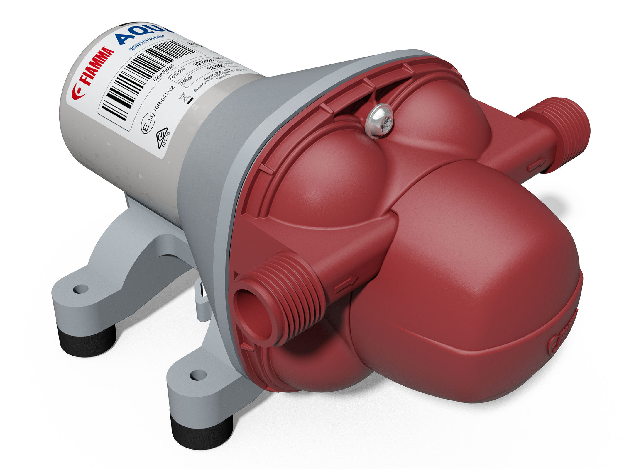 Self-priming diaphragm pump with 4 chambers for fresh water system on caravans and motorhomes. The Fiamma Aqua F pump is designed for constant and high flow rate.