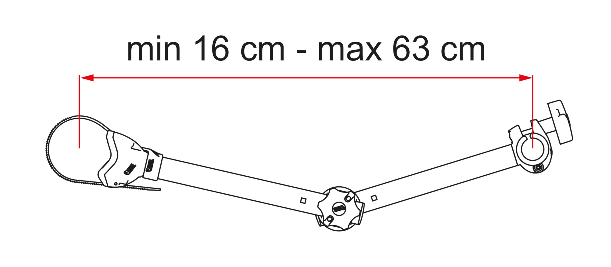 Adjustable length, articulated version of Fiamma's Bike Block Pro support arm which is also adjustable in length to make easier to route around other bikes and awkward shaped bike frames. Securely fixes the bike to the frame of the Carry Bike.