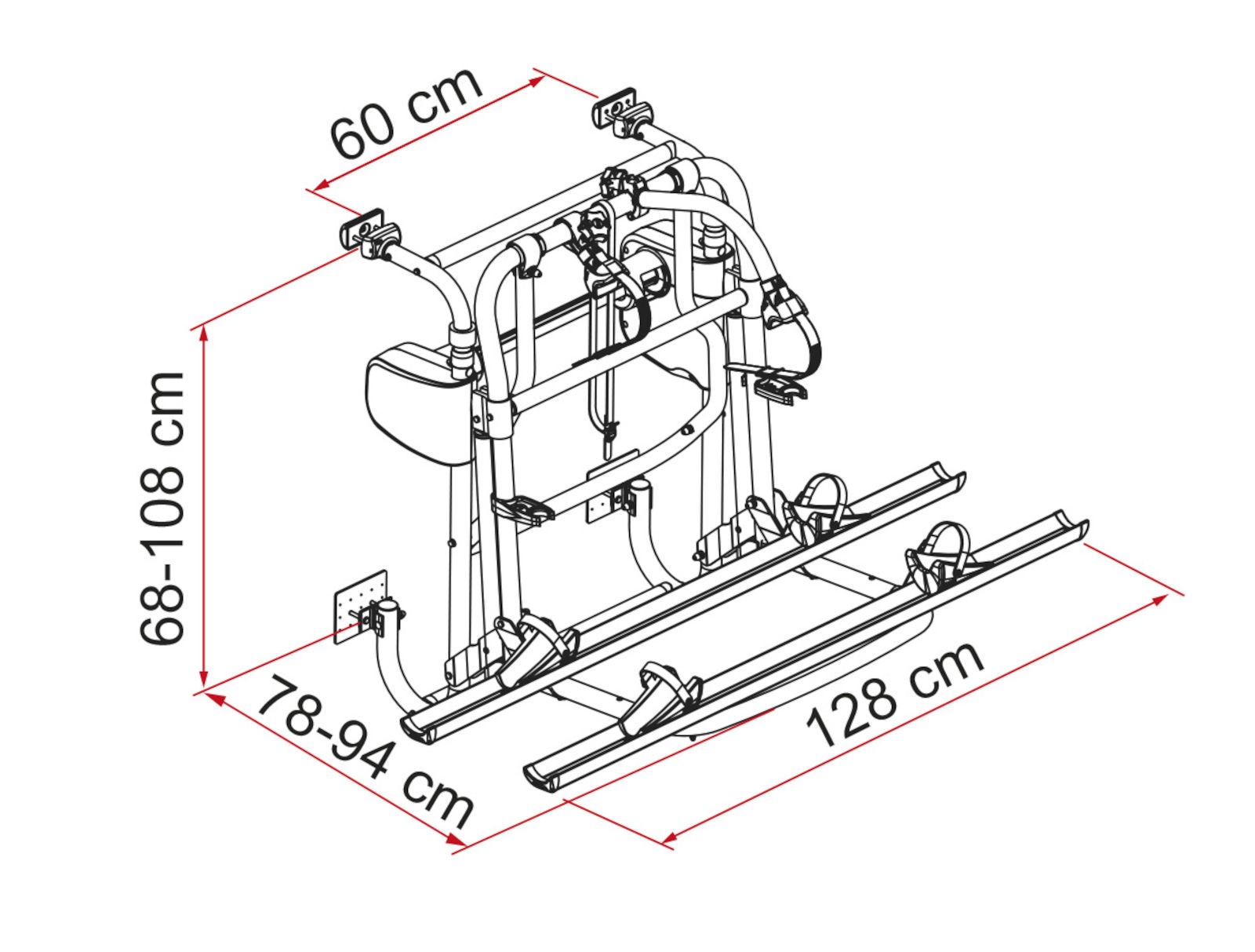 Wall fixing points with vertical wheelbase from 68 to 108cm makes it ideal for installation to many different motorhome models. Standard delivered to carry two bikes but can be adapted to carry up to 4-bikes.