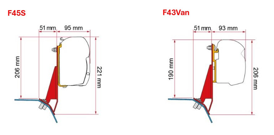 For fitting of F45 and F43 use this kit in conjunction with the flat wall brackets delivered as standard with the awning.