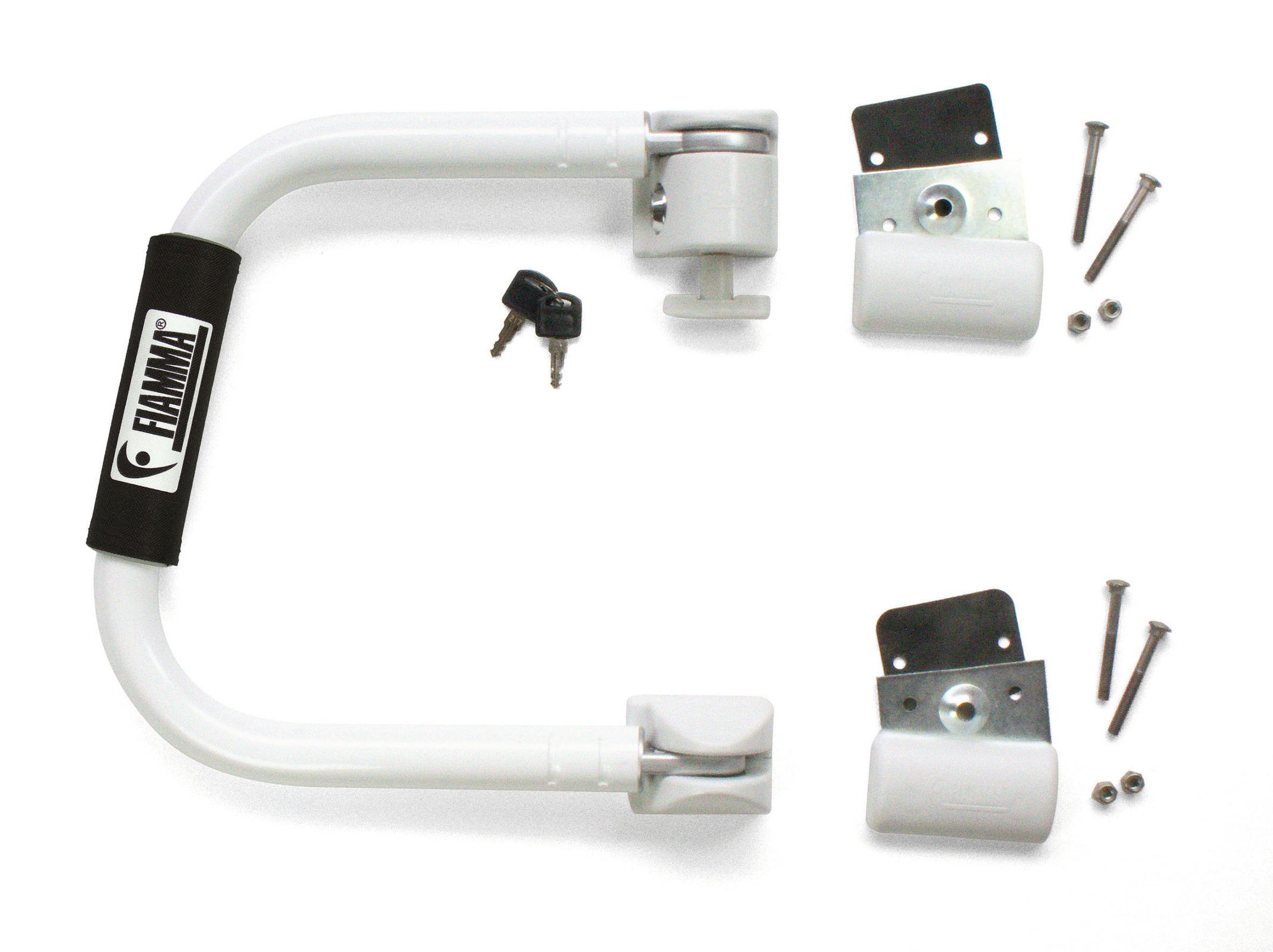 'U' shaped security bar made from solid 30mm diameter painted aluminium. The Fiamma Security handles are hinged and locked so they can bar the caravan door or swing out to be used as a handle to make entering the vehicle easier.