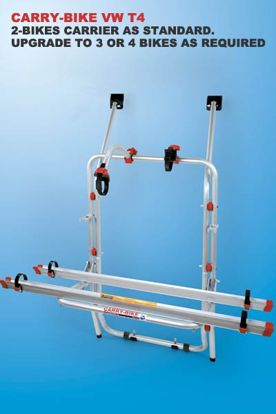 VW T4 Carry-Bike, suitable for Volkswagen T4, California, Coach, Caravelle and Multivan from 1991 to 07/2003. Simply hooks over and under the rear tailgate without the need to drill. The door can remain in use when the bikes are fitted, although it will need support when opening.