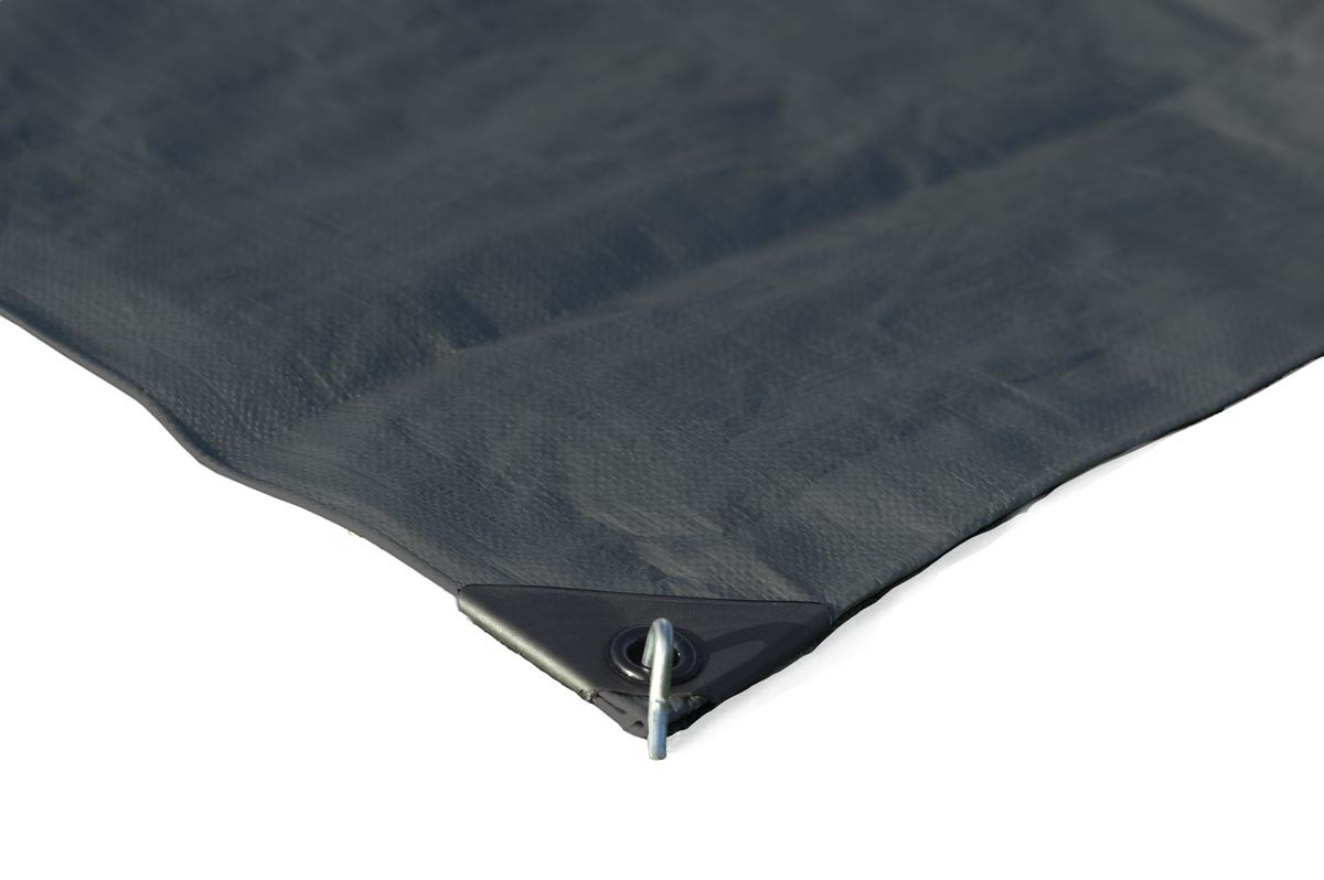 Heavy duty polyethylene groundsheet with hemmed edges and eyelet corners for pegging. Measures approx. 270 x 700cm.