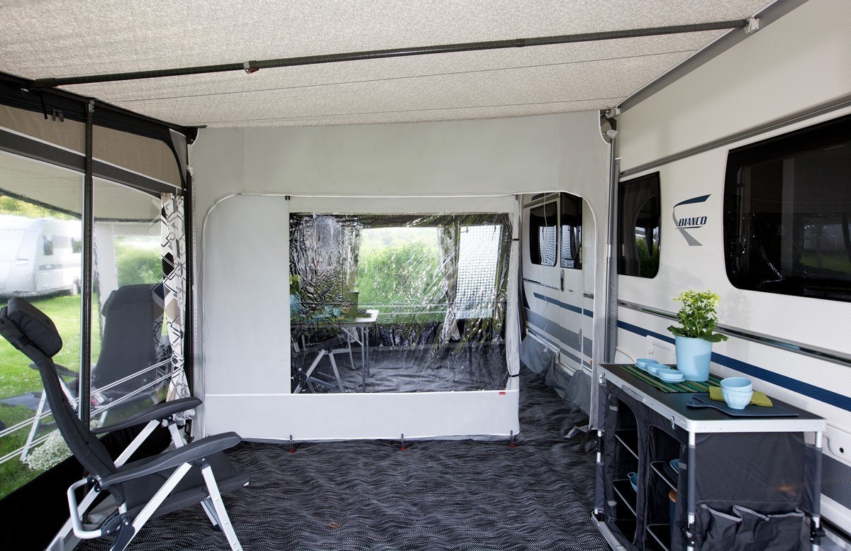 Partition wall to divide your awning into separate spaces. The wall hangs from the roof support frame but has a zip-out window and door panel to allow access through the partition. Suitable for Isabella Commodore and Ventura D300 awnings.