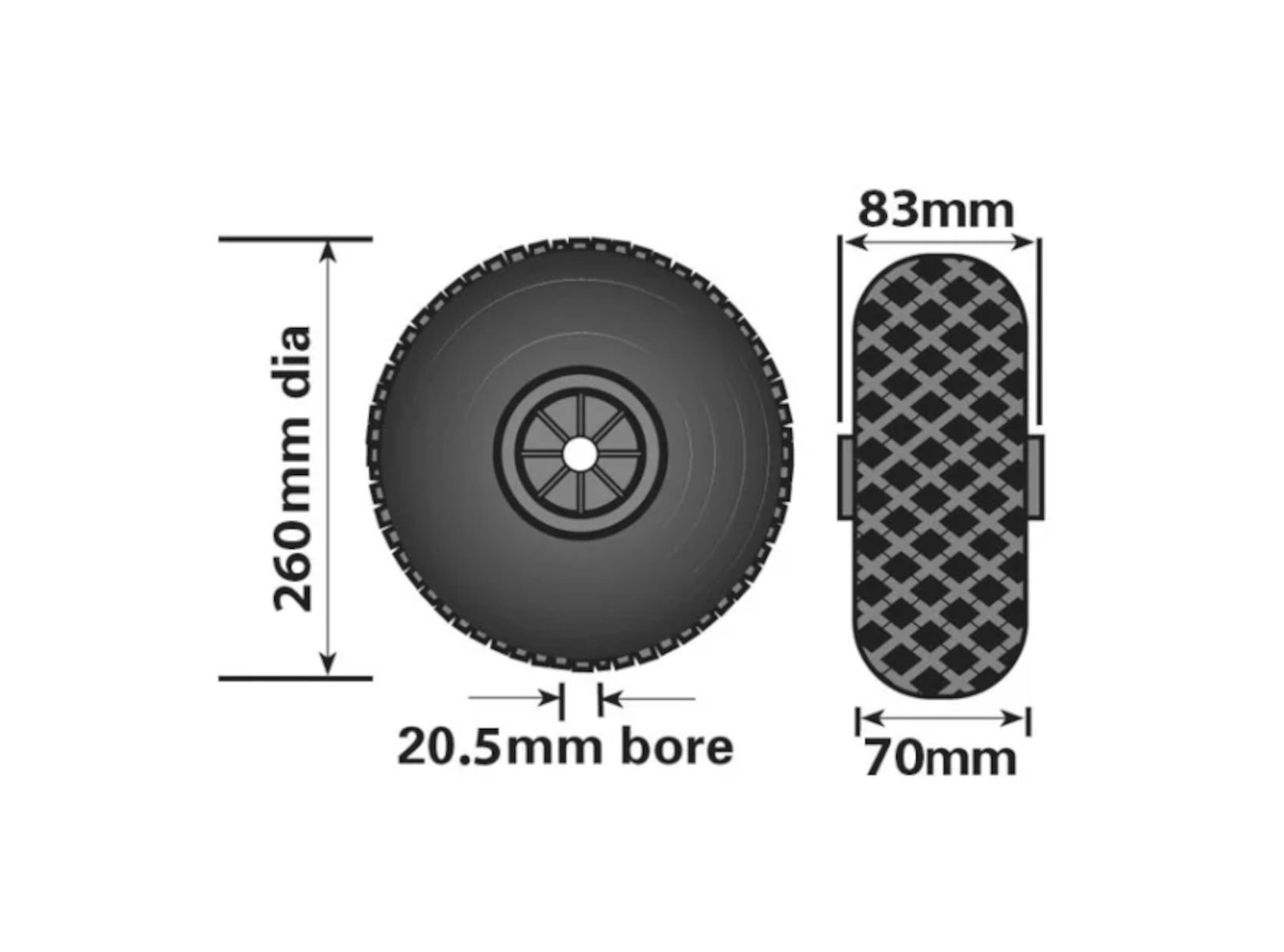 Maypole pneumatic wheel 260mm x 85mm. With a plastic wheel hub, and comes complete with tyre and inner tube.