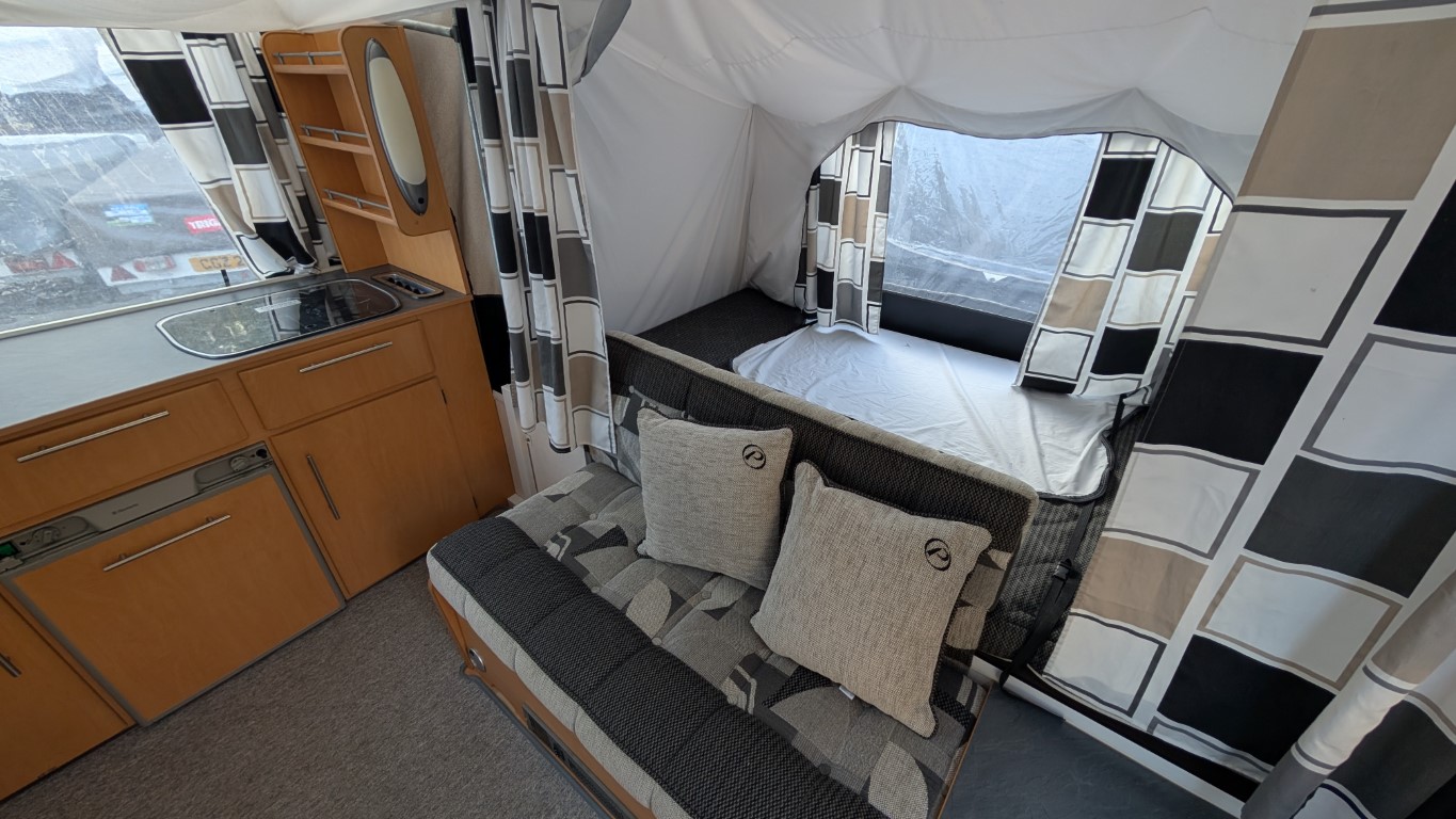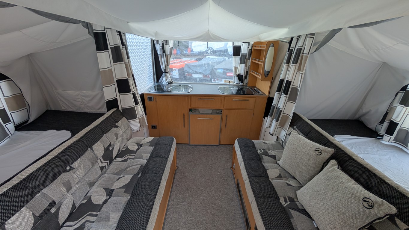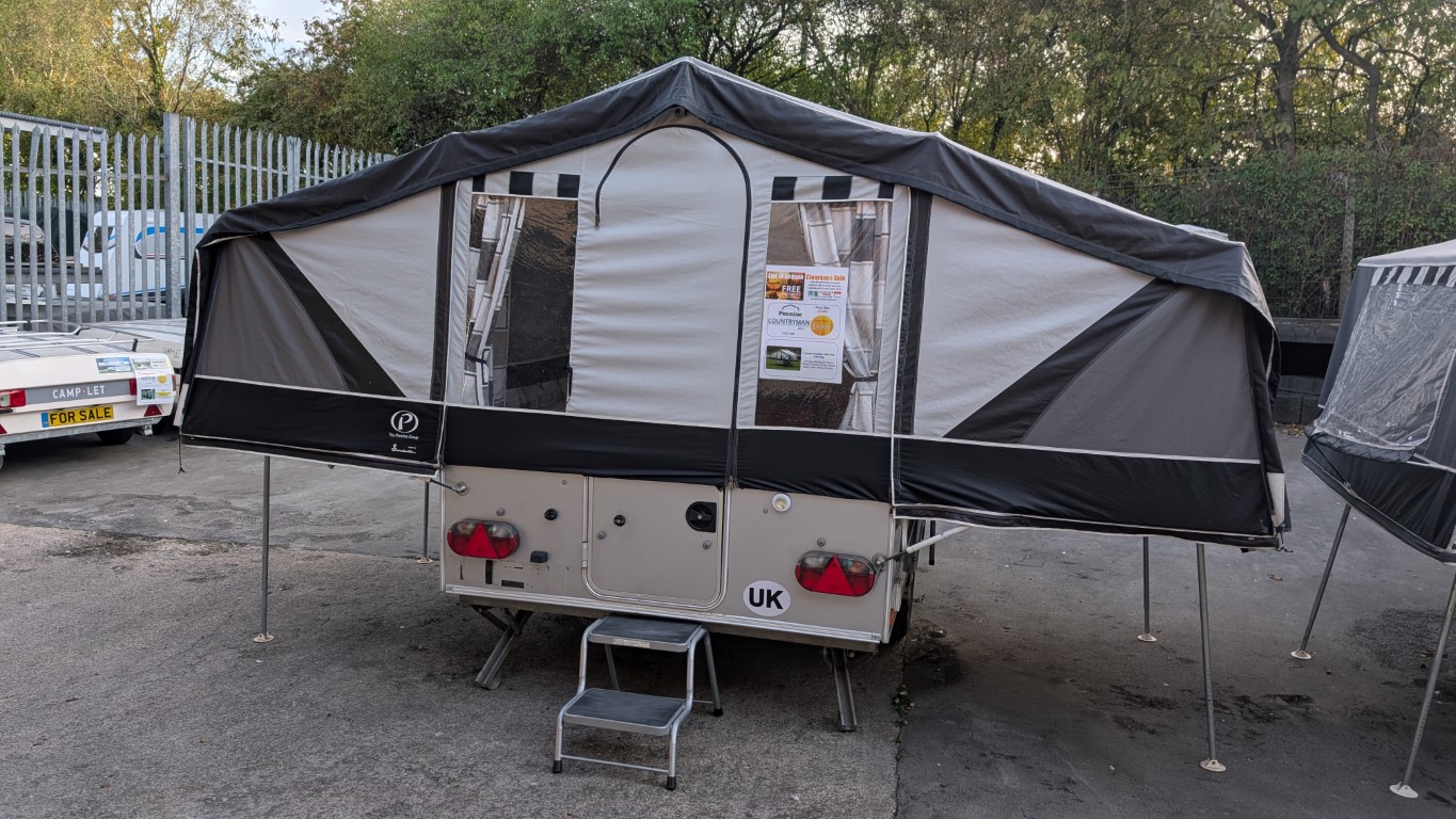 Previous generation Countryman with the silver body. All in very good condition, and comes with the extension awning on the front. Fitted kitchen inside with hob, sink and grill. 2 Large double beds as well. Have the confidence of buying this trailer tent complete with a 12 month guarantee and detailed demonstration on handover.(Ts and Cs apply) |