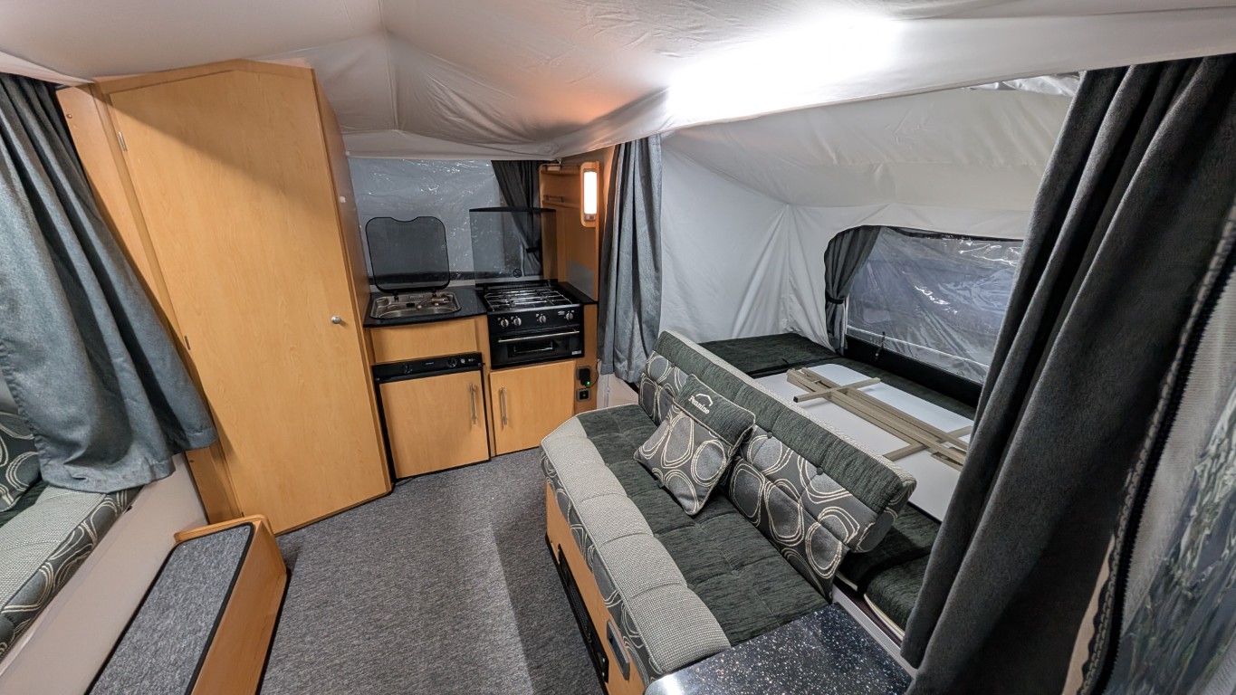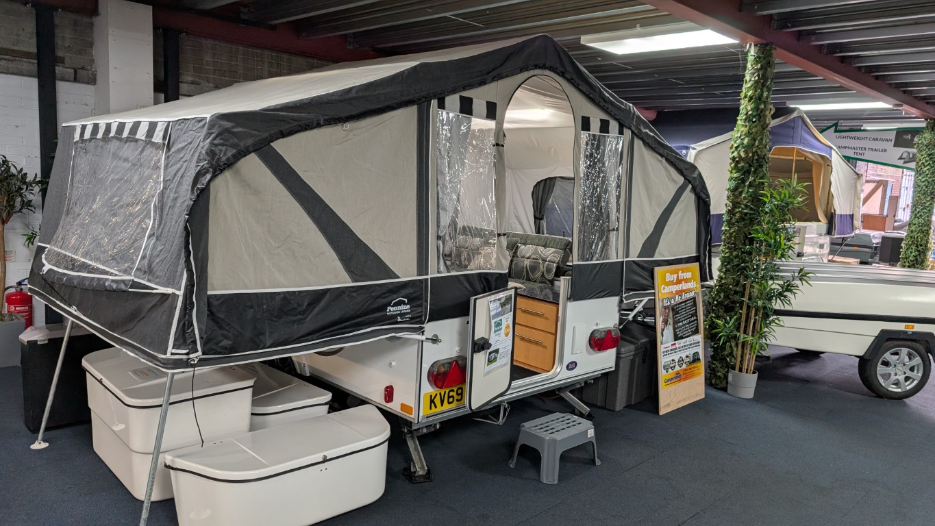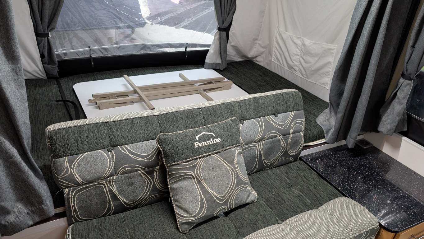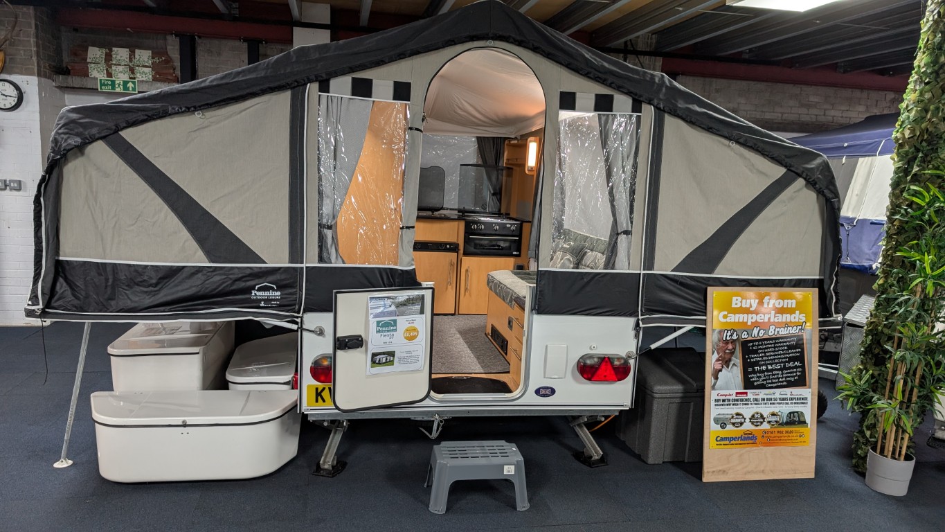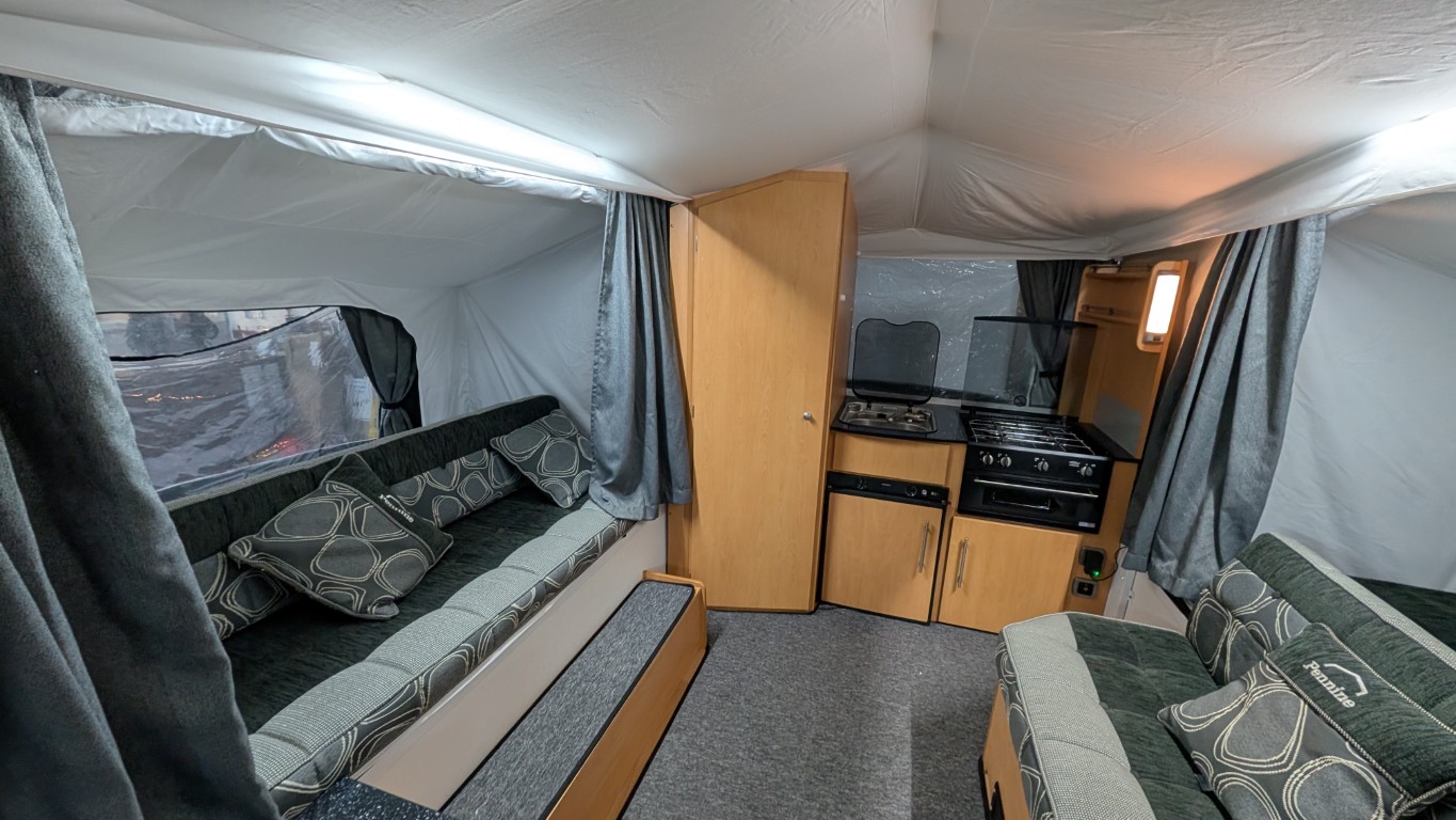 The Pennine Fiesta comes with 2 double beds, a full awning which you can attach to the living area you see here, fitted kitchen that includes a hob, grill, hot and cold water and a fitted fridge. It even comes with a loo, saving you from the late night toilet dash across the campsite. Have the confidence of buying this trailer tent complete with a 12 month guarantee and detailed demonstration on handover.(Ts and Cs apply) |