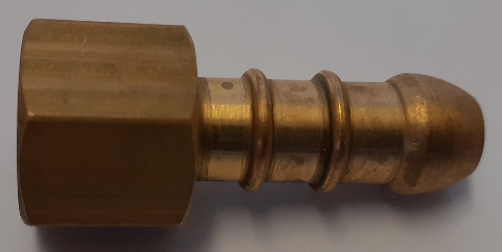 Connects a 1/4" threaded fitting to a nozzle to fit 8mm rubber gas hose.