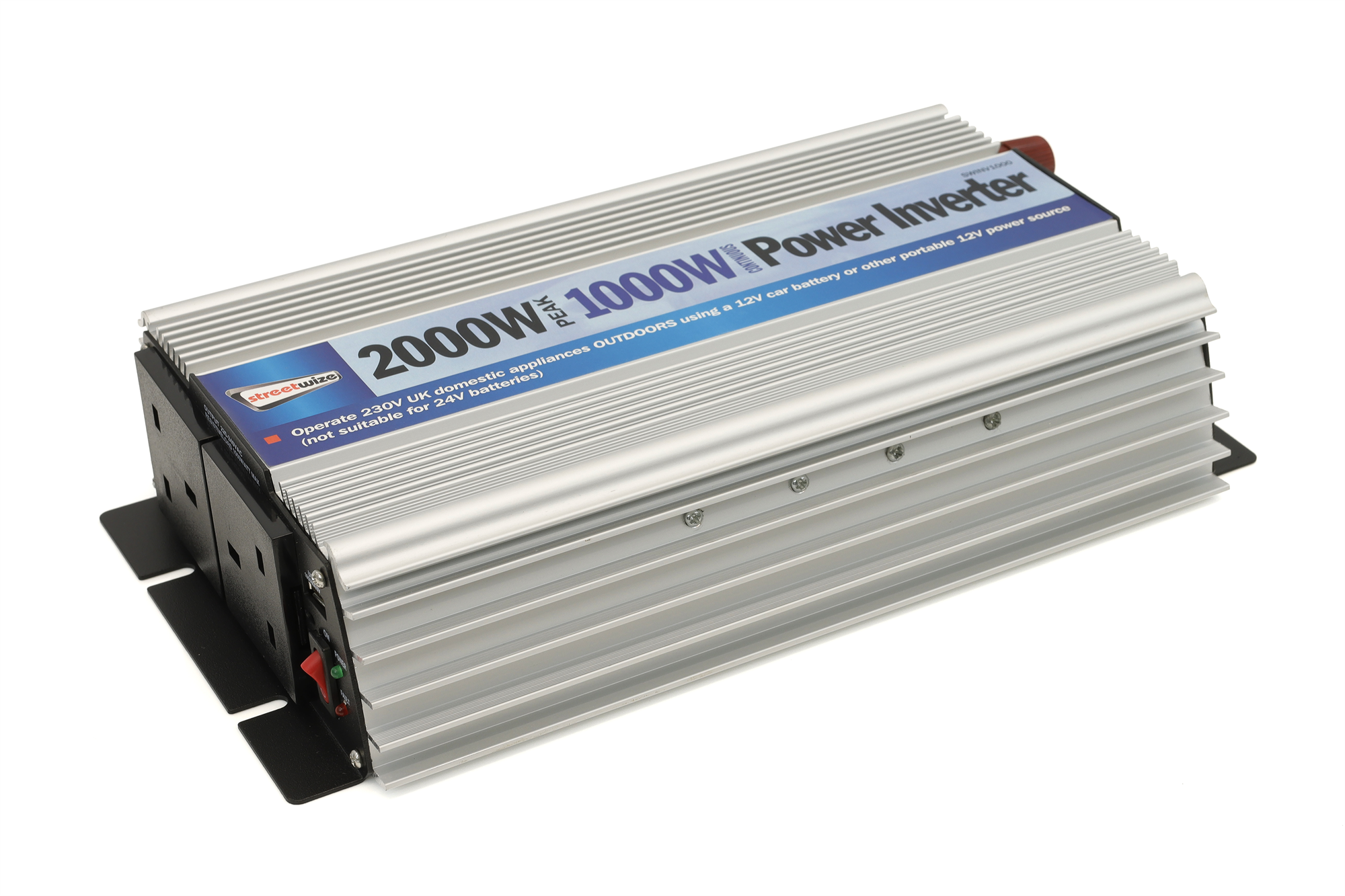 This 1000W (2000W peak) inverter safely converts the vehicle’s 12V DC battery to a 230V AC power supply.