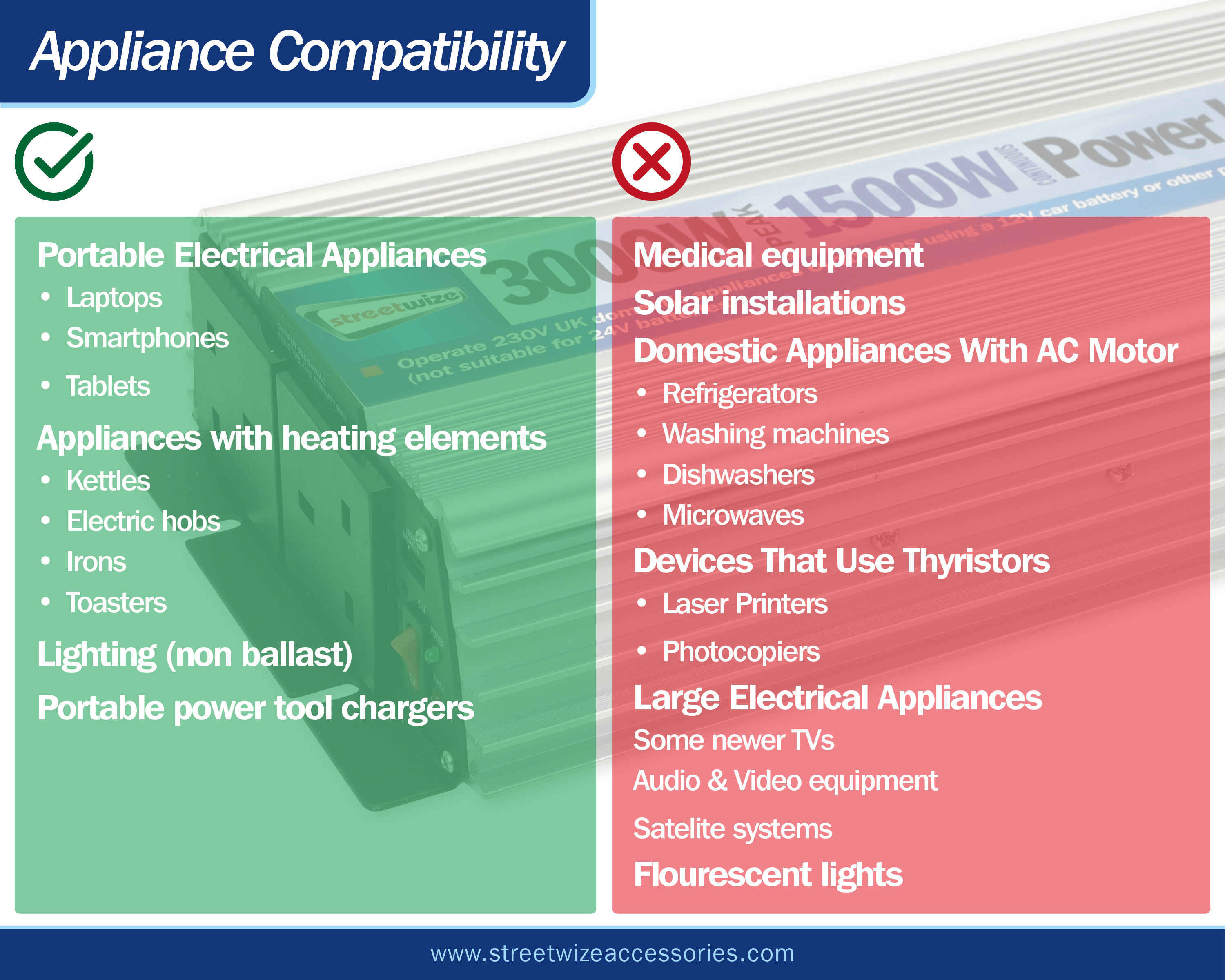 • Solar installations • Medical equipment, such as CPAP machines with humidifiers • Power tools running on AC motor and variable speed control and cordless tool battery chargers. • Some Newer TV’s – refer to manufacturer guide. • Items with digital clocks and electric timers including washing machines and bread makers. • Devices that use thyristors like laser printers and photocopiers • Fluorescent lights • Audio Equipment, satellite systems and video equipment • High power items which use an AC motor such as larger fridges, microwaves and compressors.