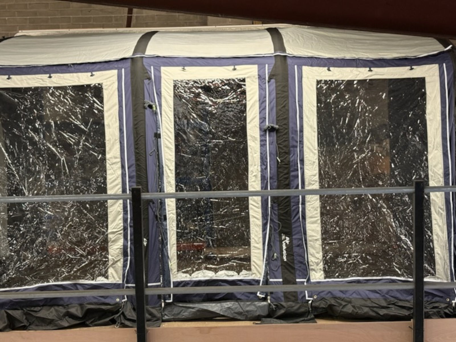 A spacious porch awning 3.9 meters in length. Complete with draught skirt and rear pole set. With a manual air pump. Complete with fly curtains. This is an ex display porch that was in our indoor display area.